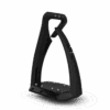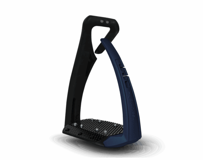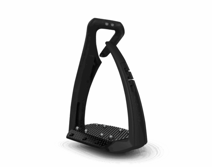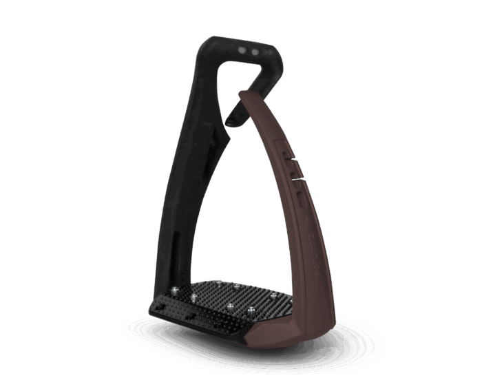 The outer branch of the stirrup is made of Elastollan®, a flexible material that deforms and allows the branch to open, facilitating foot release in case of a fall.