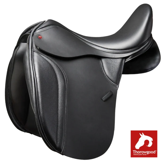 Dressage specific tree and moveable under-flap thigh blocks combine to help the rider maintain a balanced dressage position.